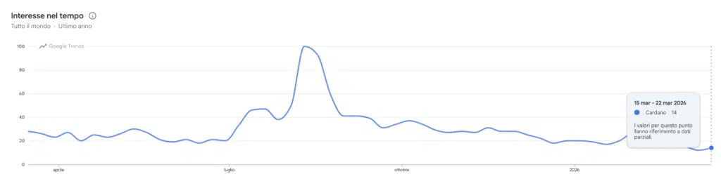 In allegato riportiamo le ricerche Google per “Cardano” dell’ultimo anno. Il valore “32” indicato al 21 novembre 2025 rappresenta l’interesse relativo, 100 è il picco massimo del periodo, mentre 14 indica un livello di interesse molto basso rispetto al periodo considerato.