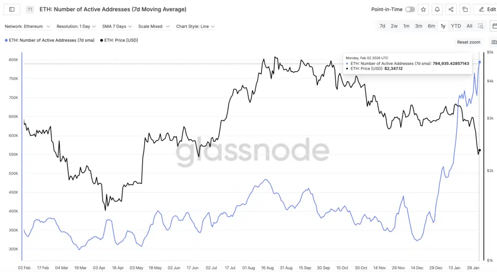 La metrica “Number of Active Addresses” di Ethereum ci mostra l’andamento del numero di indirizzi attivi di Ethereum e mostra un forte incremento ormai in atto da dicembre e ora a 794.000 indirizzi attivi. Rispetto ai minimi di area 320.000–350.000 indirizzi osservati nella primavera 2025, l’incremento segnala una ripresa dell’attività di rete e maggiore partecipazione on-chain.