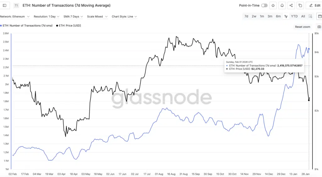Attualmente il valore è intorno a 2,42 milioni di transazioni giornaliere, in forte aumento. Questo indica un’accelerazione dell’utilizzo on-chain, nonostante un contesto di prezzo debole, segnalando partecipazione elevata e possibile disallineamento tra attività di rete e valutazione di mercato.