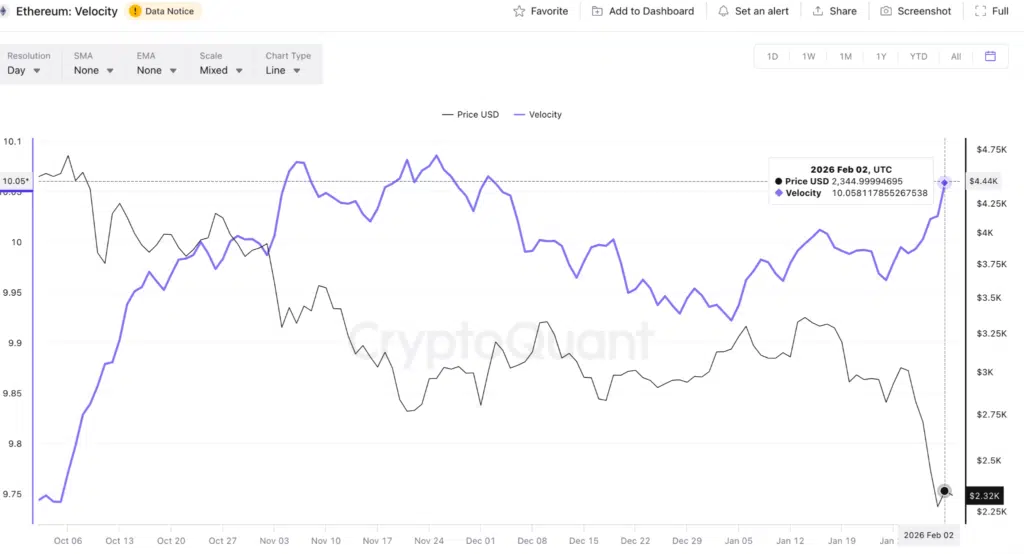 Nell’ultima fase la velocity risale verso area 10,05, segnalando un aumento dell’attività di scambio e utilizzo. Questo dato indica maggiore movimento degli ETH, non accumulo statico, in un contesto di prezzo ancora debole ma con segnali di riattivazione on-chain.