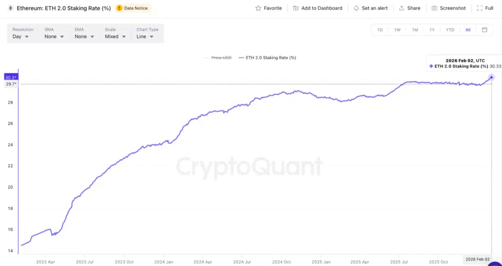 Nell’ultima fase il dato si attesta intorno al 30,33%, indicando che quasi un terzo dell’offerta è vincolata. Questo segnala forte fiducia nel protocollo e riduzione dell’ETH liquido disponibile sul mercato, con impatto potenziale sulla dinamica di offerta nel medio-lungo periodo.