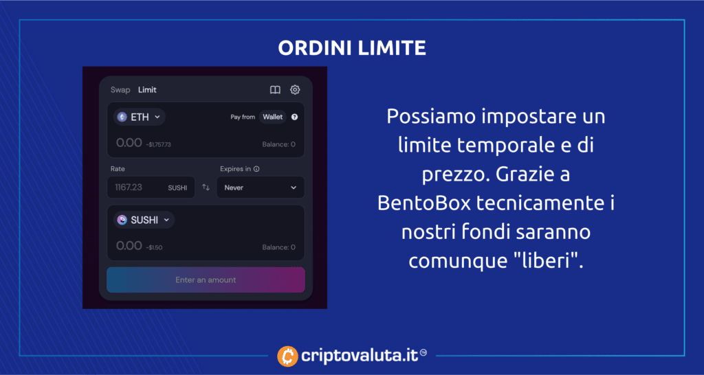 Nel caso di SushiSwap invece abbiamo l’ordine limite gestito direttamente a livello di protocollo e in modo assolutamente decentralizzato. Anche in questo caso potremo evitare di affidarci a terzi, perché sarà l’impianto di Sushi a prendersene cura. Ci sono anche qui delle particolarità che rendono SushiSwap un sistema molto interessante.