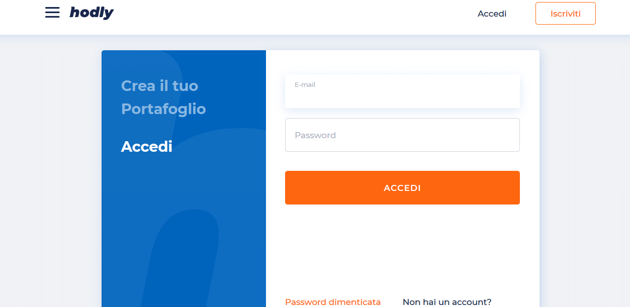 - Collegati sul sito ufficiale di Hodly ed esegui il primo accesso inserendo mail e password nel relativo pannello di controllo.