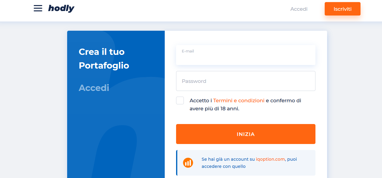 Attenzione: Laddove disponi già di un conto su IQ Option, potrai subito utilizzare il nuovo servizio Hodly. Non è infatti richiesta una nuova registrazione online. Ti basterà inserire mail e password nel suddetto Exchange.